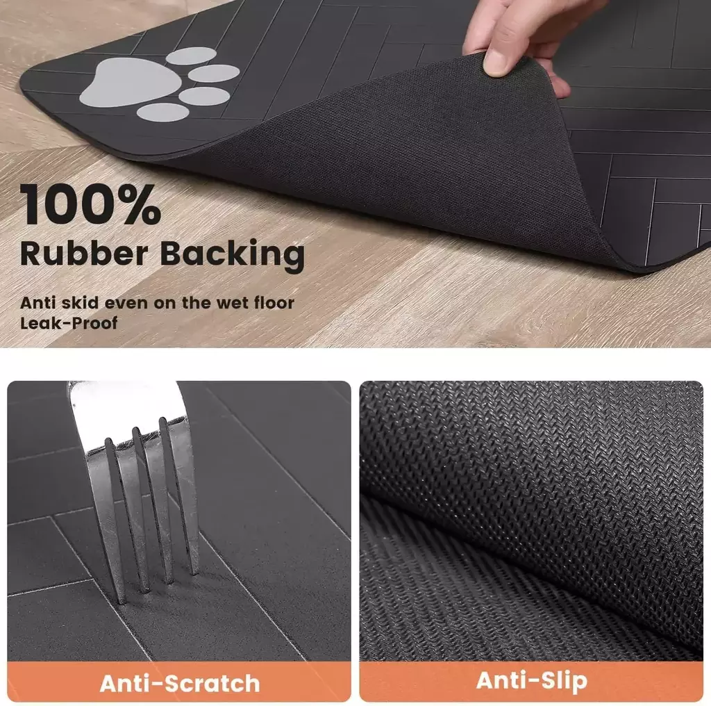 Feito com material de secagem rápida, base de borracha antiderrapante e superfície absorvente, ele protege o chão contra respingos de água, ração e sujeira — evitando bagunça e deixando tudo mais bonito e organizado.